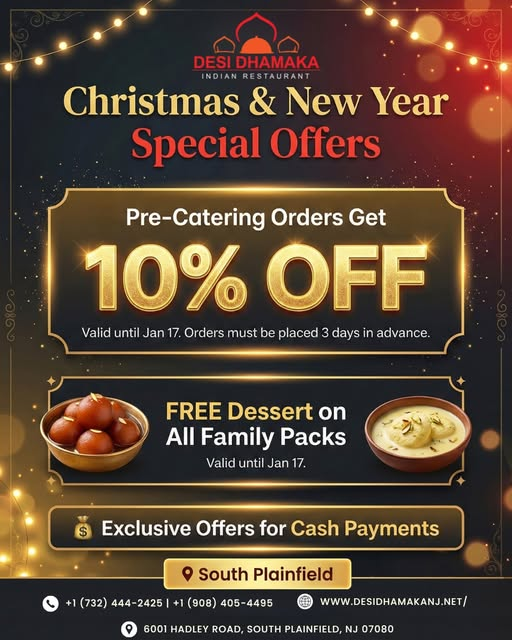 Welcome the New Year with authentic Indian catering crafted for unforgettable celebrations. Our pre-order New Year catering services are perfect for parties, family gatherings, and corporate events, offering festive flavors, generous portions, and hassle-free planning. Celebrate in style with freshly prepared dishes designed to impress every guest.